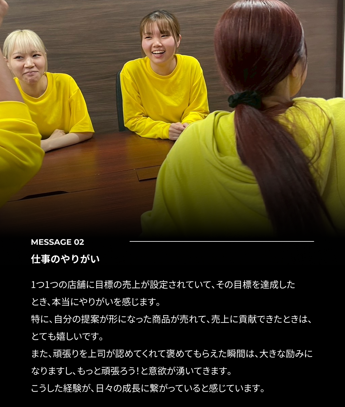 A:新店舗出店時などは忙しい時期もありますが、チームで協力し合いながら働く楽しさがあります。