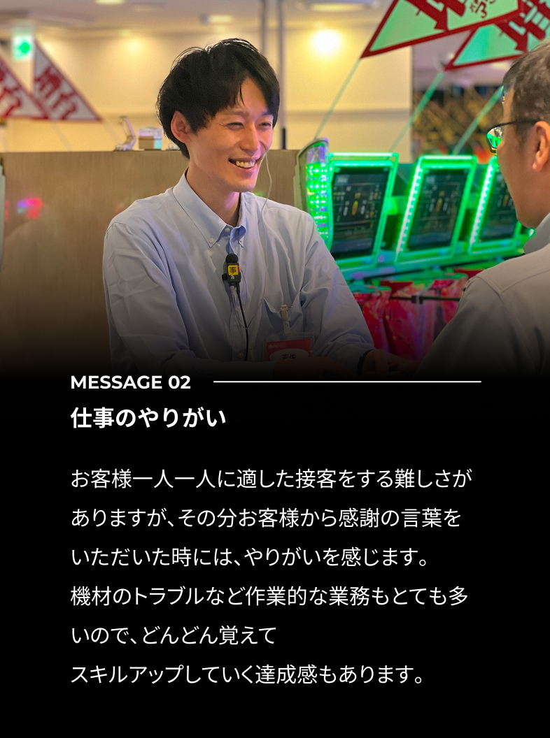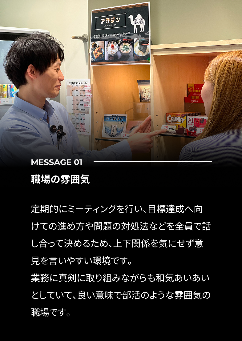 最初はアルバイトとして入社しましたが、働く中で「もっといろいろなことに挑戦したい」と思うようになり、社員を目指しました。覚えることや考えることがたくさんあって大変な時もありますが、先輩たちが優しくサポートしてくれるので、安心して仕事に取り組むことができています。