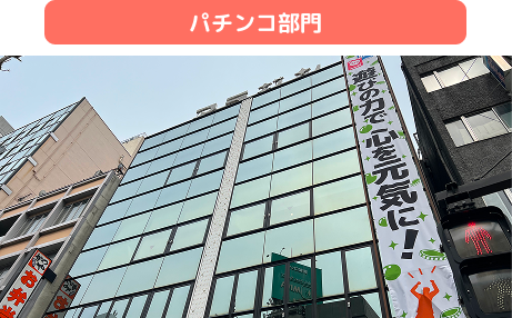 パチンコ部門、飲食・物販部門、管理部門による三位一体の