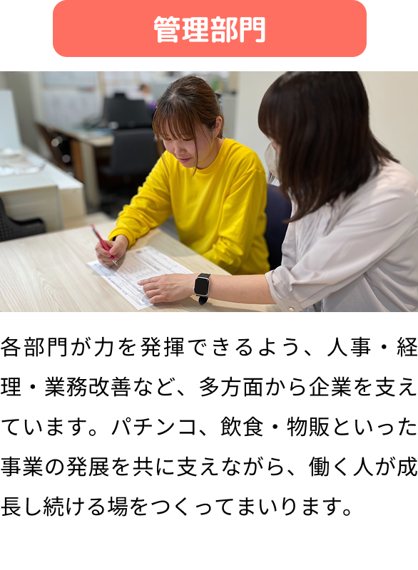 各部門が力を発揮できるよう、人事・経理・業務改善など、多方面から企業を支えています。パチンコ、飲食・物販といった事業の